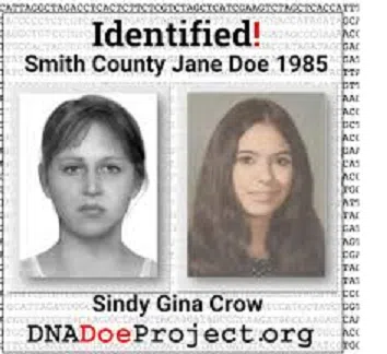 A woman’s body was found along 1-20 in Tyler by a highway mowing crew in 1985 and her remains were finally identified as then Sindy Gina Crow of Arlington. She was born on September 12, 1957.