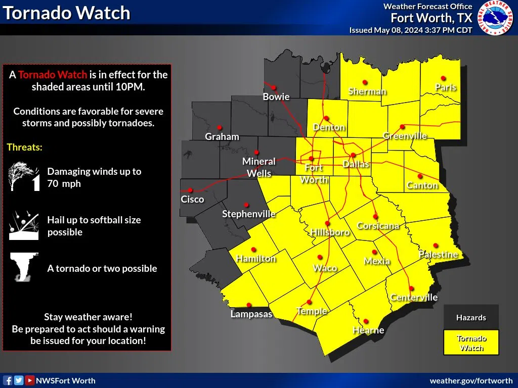 FORT WORTH – (WBAP/KLIF) – The National Weather Service of Fort Worth issues a tornado watch for much of North and Central Texas through 10 pm this/Wednesday evening. Hazardous weather may additionally be generated in the next several days as a new system makes it’s way from west to east.