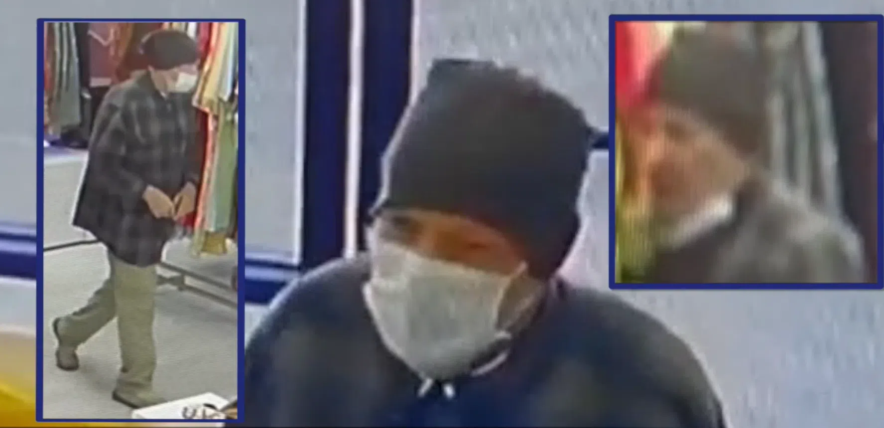 It shows a masked man walking into the building near Highway 183 and Esters Road.