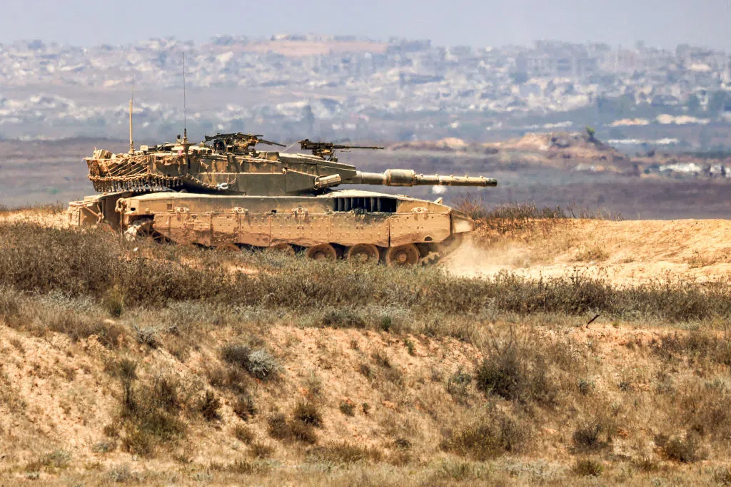 An Israeli army main battle tank moves along an area near the border with the Gaza Strip and southern Israel on July 2, 2024 amid the ongoing conflict in the Palestinian territory between Israel and H...