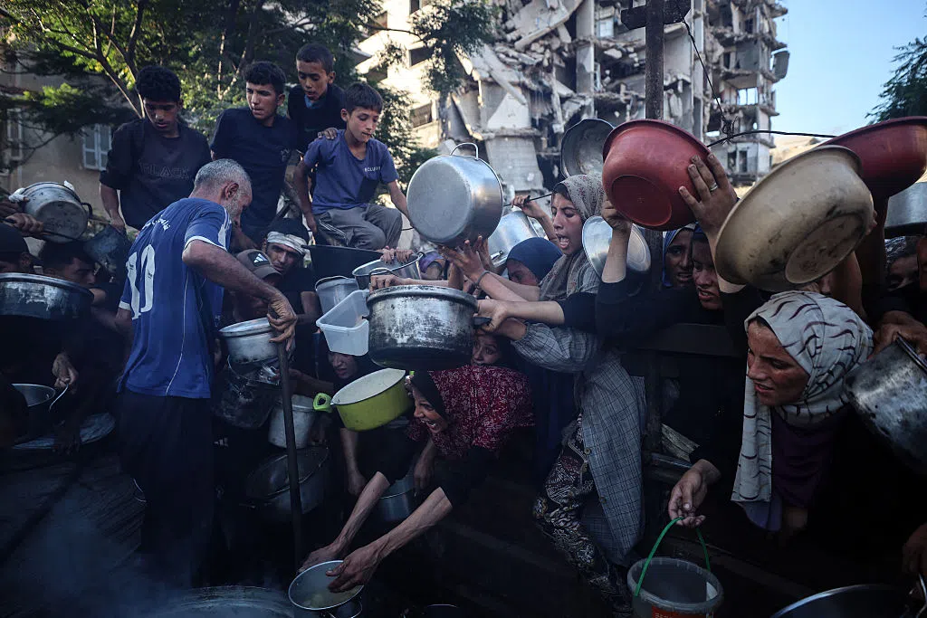 Palestinians gather at a food distribution point in Gaza City, on July 20, 2025. The World Food Programme says nearly one in three people in Gaza do not eat for days at a stretch, and ”thousands...
