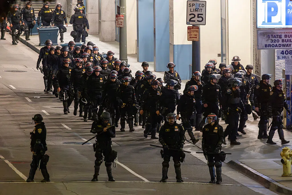 LOS ANGELES, CALIFORNIA – JUNE 10: Police officers pursue people roaming the streets after a nighttime curfew takes effect while protests continue in Los Angeles in response to a series of immig...