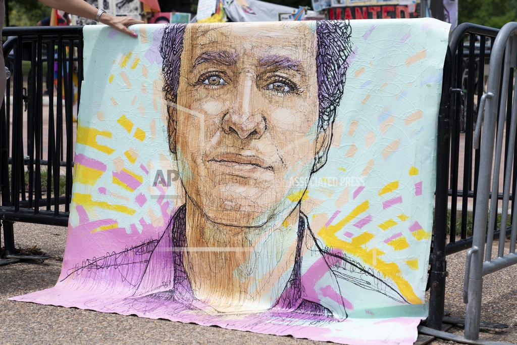 FILE – A drawn portrait of Marc Fogel, who has been detained in Russia since August 2021, hangs on rails outside of the White House during a demonstration organized by his family, July 15, 2023,...