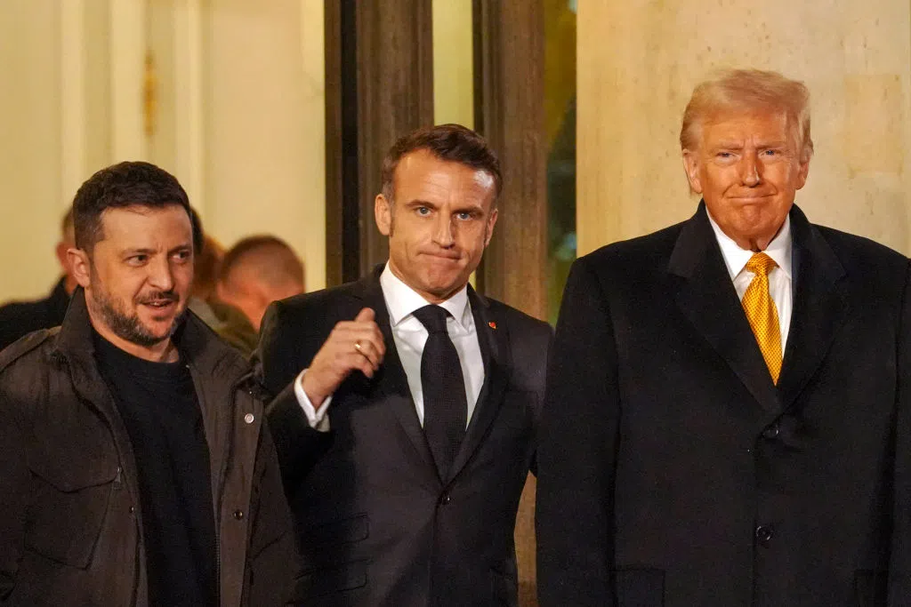 PARIS, FRANCE – DECEMBER 07: French president Emmanuel Macron (C) interacts with president elect, Donald Trump, (R) and Ukrainian president Volodymyr Zelenskyy at the Elysee palace on December 0...